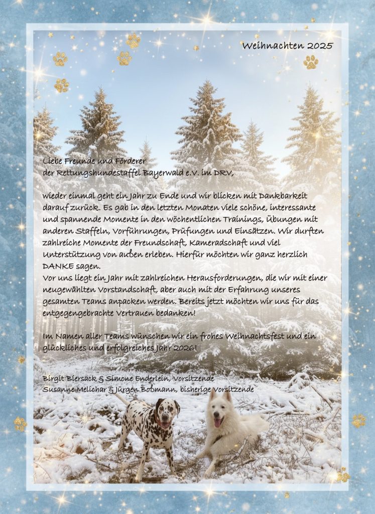 Frohe Weihnachten und alles Gute für 2026! Dez. 24, 2025 Die Teams der Rettungshundestaffel Bayerwald e.V. im DRV wünschen allen Freunden und Förderern der Staffel ein frohes Weihnachtsfest und ein glückliches und erfolgreiches Jahr 2026!